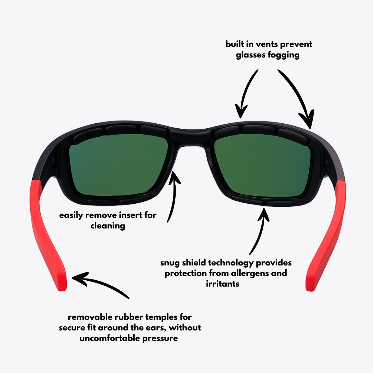 Our original sunglasses combine everyday style with practical protection. Featuring a discreet foam insert, they shield against wind, dust, and airborne irritants — offering relief for allergy and dry eye sufferers. Designed for day-to-day wear, they include silicone on the temples for a secure, comfortable fit that lasts all day.